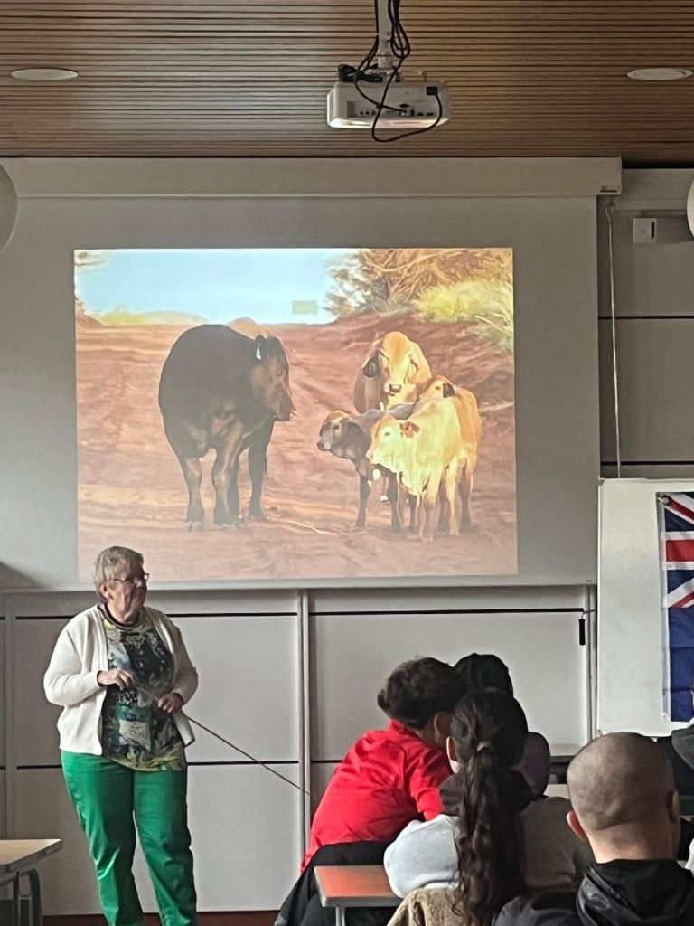 Die Referentin schilderte den Schülerinnen und Schülern zahlreiche außergewöhnliche Erlebnisse, die von der rauen Realität des Landes zeugen. So legten etwa Ameisen den Motor ihres Campingbusses lahm oder bedienten sich ungeniert an einer Melone im Kühlschrank. Im Outback musste sie beim Aufenthalt im Freien ein Netz über dem Gesicht tragen, um sich vor den allgegenwärtigen Fliegen zu schützen – ein Schutz, den sie im Unterricht anschaulich demonstrierte.