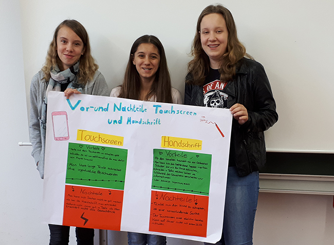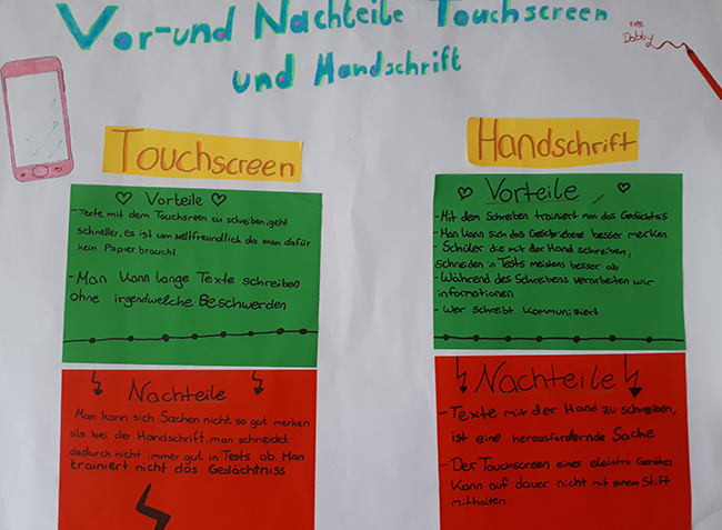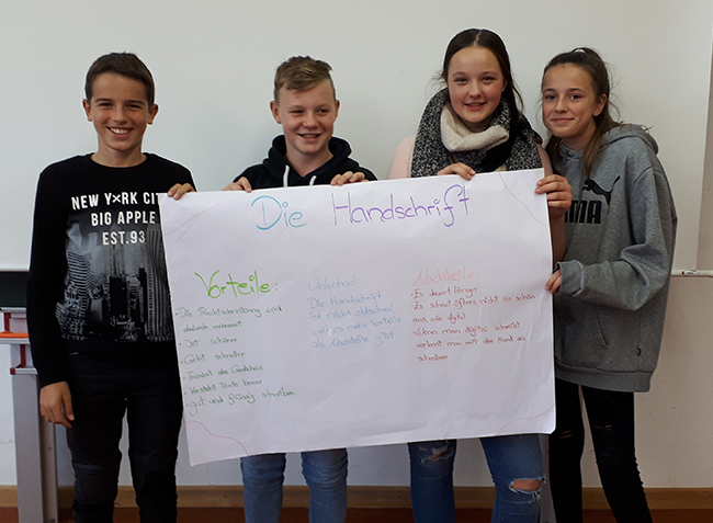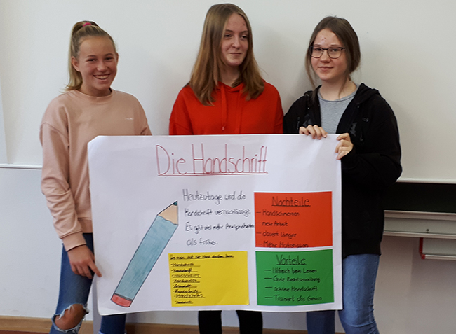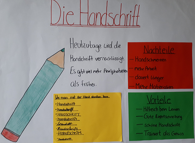 Vor diesem Hintergrund fand nun in den 8. Klassen im Deutschunterricht von Fr. Ponkratz und Frau Rieger in Zusammenarbeit mit dem Schreibmotorik Institut e.V. das Projekt „Bildungschance Handschrift“, einem Projekt der Aktion Handschreiben 2020, statt. Dieses Projekt umfasst einen Text mit Aufgaben in 3 Schwierigkeitsstufen. Dabei setzten sich die Schüler mit der Thematik intensiv auseinander, insbesondere mit den Vor- und Nachteilen des Tippens bzw. Handschreibens. Als Endprodukt erstellten sie in Gruppen Plakate, welche der restlichen Klasse vorgestellt wurden und im Schulhaus aushängen.