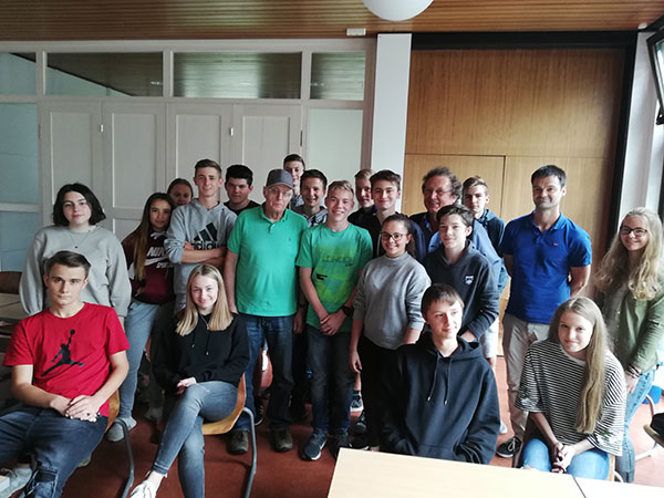 Rainer Dellmuth (Mitte) mit Schülern der 9. Klasse, sowie Geschichtslehrer Daniel Wollinger (2.v.r.) und Religionslehrer Alois Straßer (3.v.r.)