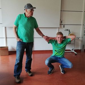 Rainer Dellmuth führt mit Schüler Samuel Eder den bei Stasi-Gefangenen berüchtigten „Entengang“ vor. Bei dieser Strafmaßnahme mussten die Häftlinge oft bis zur Ohnmacht mit gebeugten Knien treppauf und treppab gehen oder hüpfen.