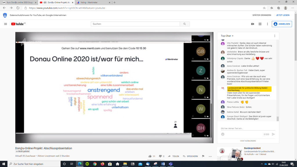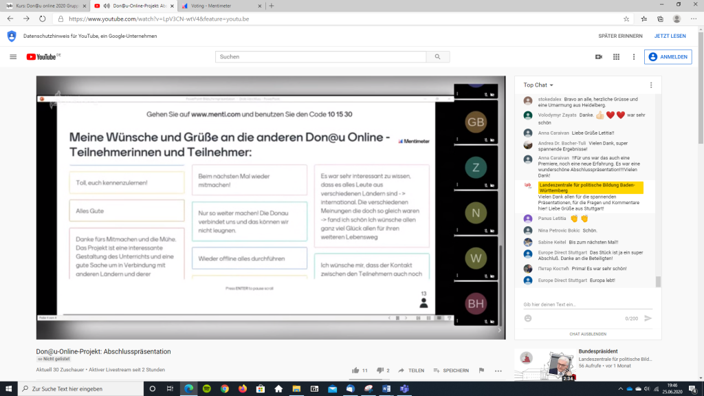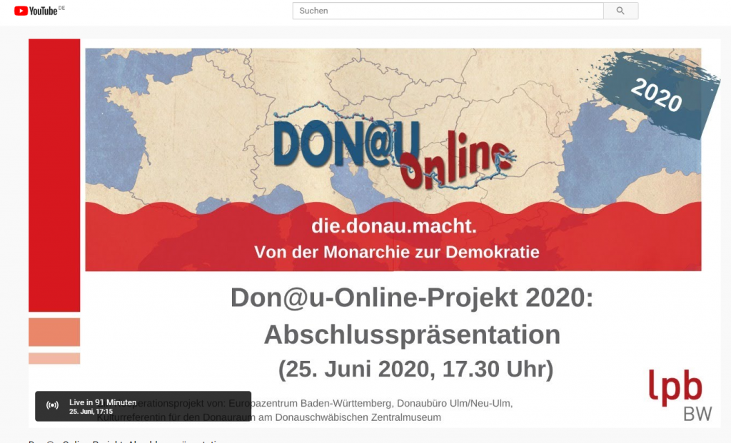 Ursprünglich war geplant, dass die Ergebnisse im Rahmen eines Jugendcamps während des Donaufestes in Ulm offiziell präsentiert werden sollen. Jeweils zwei Schüler der beteiligten Schulen hätten daran teilnehmen dürfen. Nachdem das Donaufest coronabedingt abgesagt werden musste, durften nun jeweils zwei Schüler der einzelnen Teams ihre Ergebnisse in einer online-Videokonferenz präsentieren, die live auf youtube übertragen wurde. Diese Ergebnisse werden demnächst auch auf der Homepage des Don@u-Online-Projektes (www.donau-online-projekt.de) zu sehen sein. Eventuell gibt es als Ersatz im nächsten Jahr ein Treffen in Novi Sad/Serbien oder Timisoara/Rumänien, wo im Juli 2021 im Rahmen der Europäischen Kulturhauptstädte eine internationale Jugendbegegnung stattfindet.