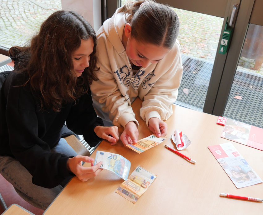 An der Wirtschaftsschule Passau fand in der Woche vor Weihnachten ein Vortrag zum Thema Falschgeld und Jugendgirokonto statt. Die beiden Auszubildenden der Sparkasse Passau, Frau Ganserer und Herr Seidler, informierten die Schülerinnen und Schüler der Jahrgangsstufe 7 im Rahmen des Unterrichtsfaches Ökonomische und Digitale Bildung (ÖBDB) über die Gefahren von Falschgeld. Der Vortrag sensibilisierte die Schülerinnen und Schüler, falsche Banknoten und Münzen anhand der bekannten Sicherheitsmerkmale zu erkennen. Dazu hatten die Referenten mehrere sog. „Blüten“ dabei, die von den Schülerinnen und Schülern ausgiebig untersucht wurden. Des Weiteren wurde auf die Konsequenzen hingewiesen, wenn Falschgeld in Umlauf gebracht wird und welche Schritte zu erledigen sind, wenn man selbst Falschgeld erhalten hat.