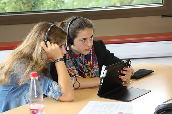 Schülerinnen der Klasse 9 C befassen sich mit auf Tablet-PCs multimedial aufbereiteten Lebensläufen von jüdischen Jugendlichen in Deutschland