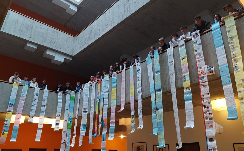 Bunte Papierbahnen, die sich meterlang vom Geländer herabrollen, prägen derzeit das Bild im Schulgebäude. Was auf den ersten Blick wie eine Kunstinstallation wirkt, entpuppt sich als besonderes Unterrichtsprojekt: Schülerinnen und Schüler haben sogenannte Leserollen gestaltet – handschriftliche Arbeiten, die Sachwissen, Kreativität und Eigenleistung miteinander verbinden.