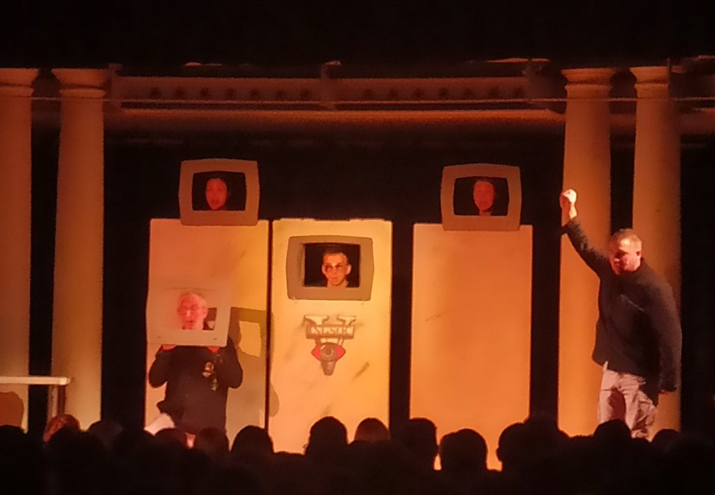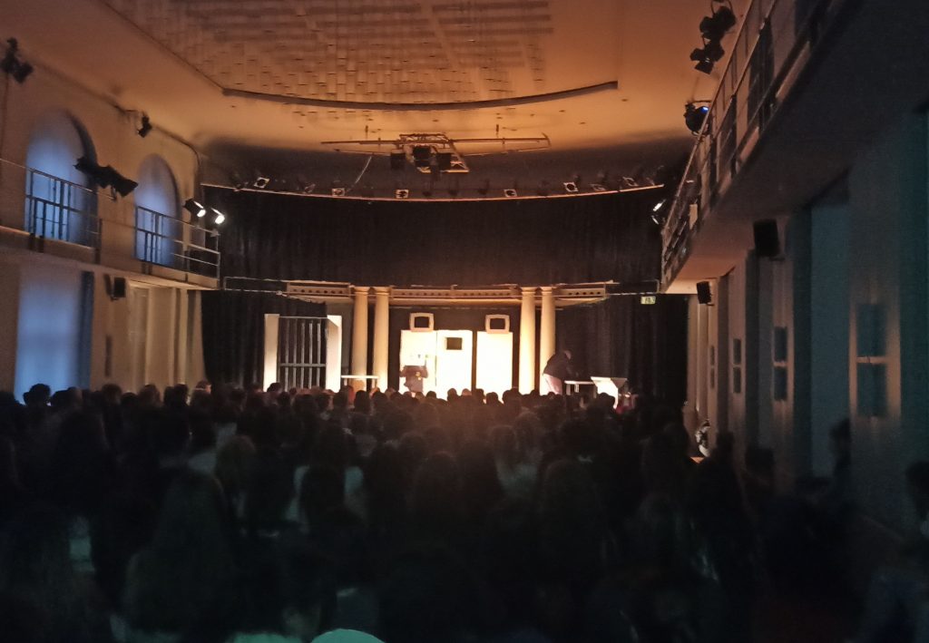 So durften die Schülerinnen und Schüler Auszüge aus einer B1-Niveau- sowie einer Graphic-Novel-Ausgabe lesen und zwei Kapitel in einem Podcast hören. Während und nach dem Lesen wählten die Schülerinnen und Schüler Aufgaben aus einem vielfältigen Aufgabenpool und bearbeiteten diese überwiegend selbstständig. So wurden beispielsweise eigene Hörtexte aufgenommen oder Textstellen zeichnerisch oder filmisch dargestellt und neu interpretiert. Es entstanden äußerst gelungene und kreative Kunstwerke. „Ich fand gut, dass ich aus verschiedenen Aufgaben wählen konnte. Es gab auch Einzel-, Partner- und Gruppenarbeit zur Auswahl, sodass für jeden etwas dabei war. Mir hat der Videodreh besonders gefallen.“ , so ein Schülerfeedback. Während der Umsetzung ihrer Ideen nahmen die Schülerinnen und Schüler vielfältige Bezüge zu vergangenen und aktuellen gesellschaftlichen Entwicklungen wahr, welche gemeinsam reflektiert wurden. Als besonderes Highlight des Projekts durfte sich die Klasse eine fesselnde Inszenierung der American Drama Group in der Redoute ansehen.