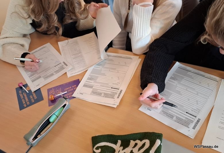 Anhand eines Musterschülers, der einer Ferienbeschäftigung nachging und dafür Lohnsteuer entrichten musste, füllten die Schülerinnen beispielhaft eine Steuererklärung aus. Auf diese Weise wurde deutlich, dass SchülerInnen in vielen Fällen die einbehaltene Lohnsteuer im Rahmen der Einkommensteuererklärung vollständig zurückerstattet bekommen.