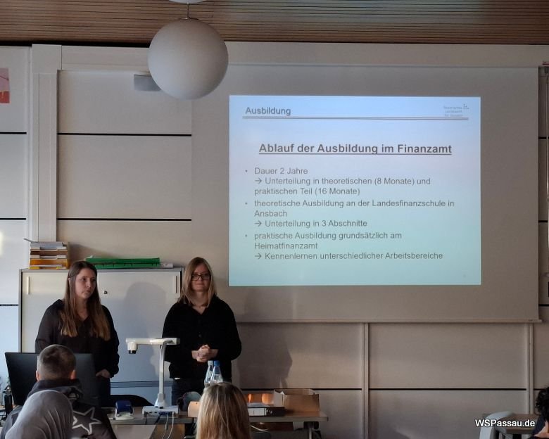 Im Anschluss stellten die Referentinnen die Voraussetzungen, Verdienstmöglichkeiten und den Ablauf einer Ausbildung beim Finanzamt vor. Dadurch erhielten die SchülerInnen nicht nur einen Einblick in steuerliche Grundlagen, sondern auch in mögliche berufliche Perspektiven im öffentlichen Dienst.